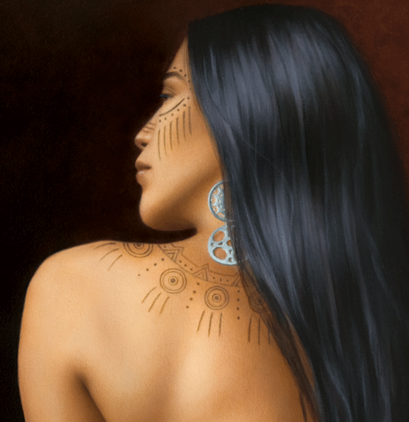 A beautiful, Southeastern Native woman from the Moundbuilder period, with Mississippian style tatoos. The hand-sculpted motif on frame is inspired by Southeastern Native American artworks. (Adoesha Bennett, Model)