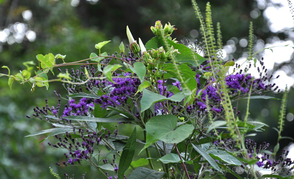 "Blooming Wild Sweet Potato Vine on purple Baldwins Ironweed "